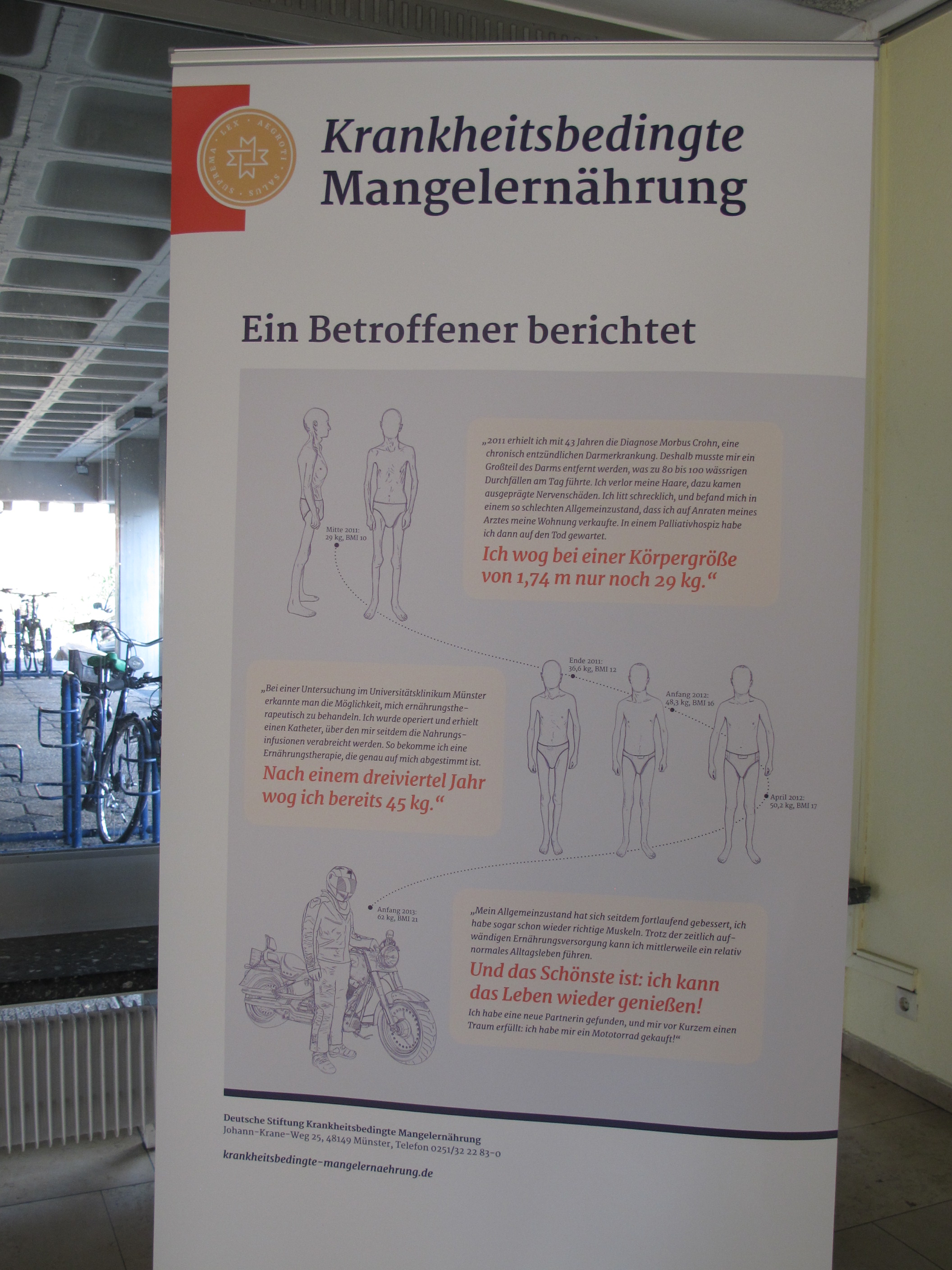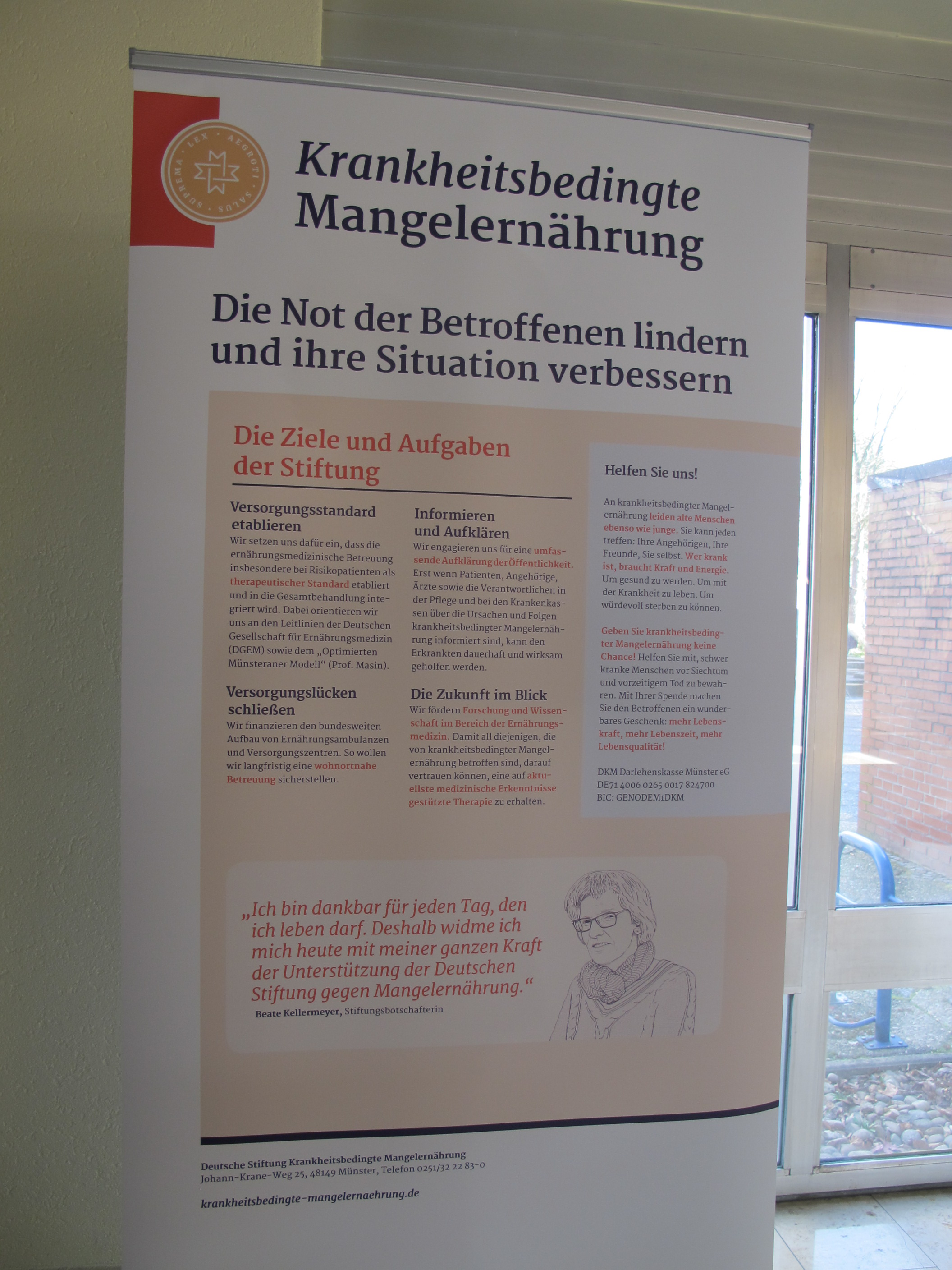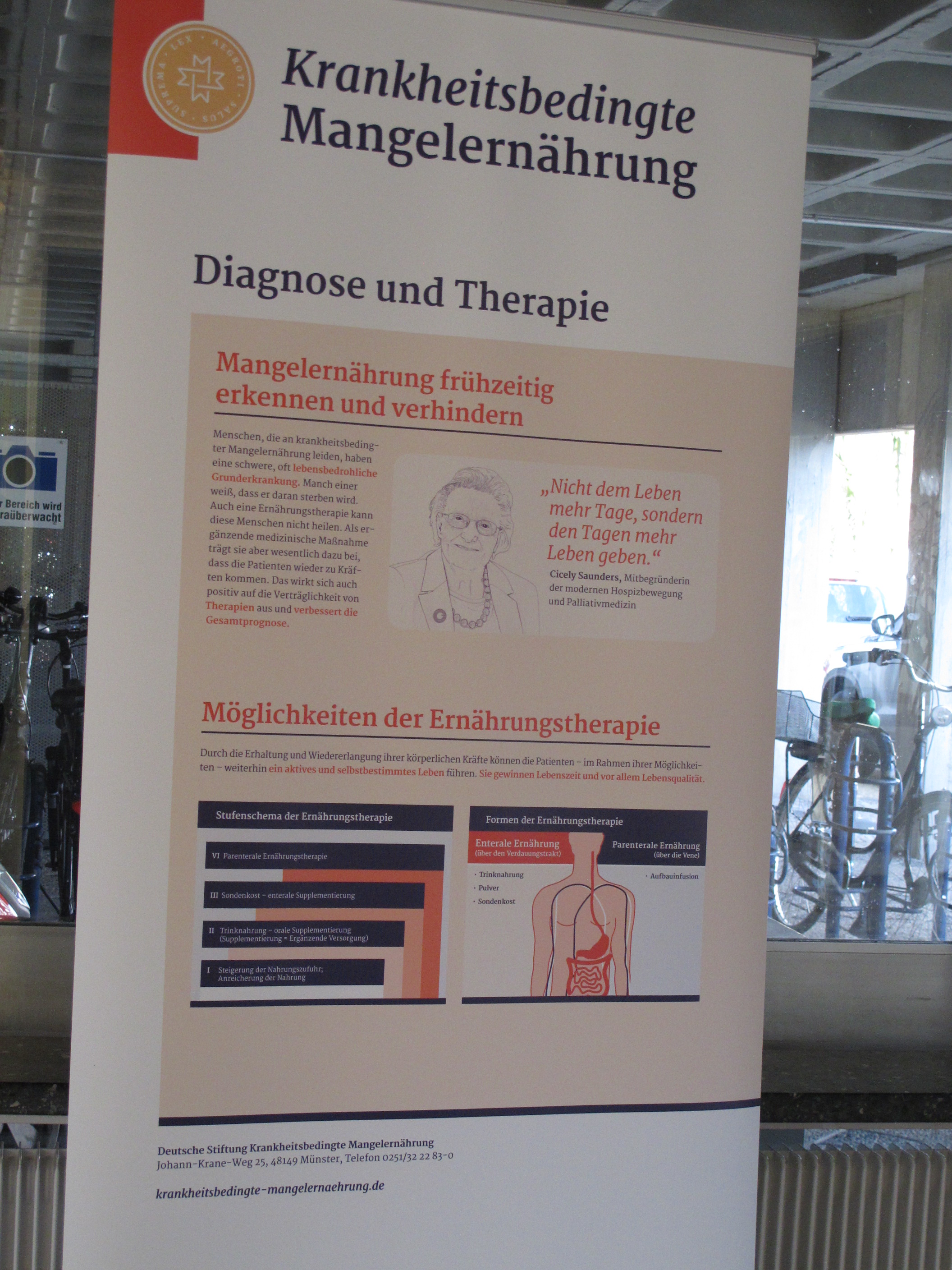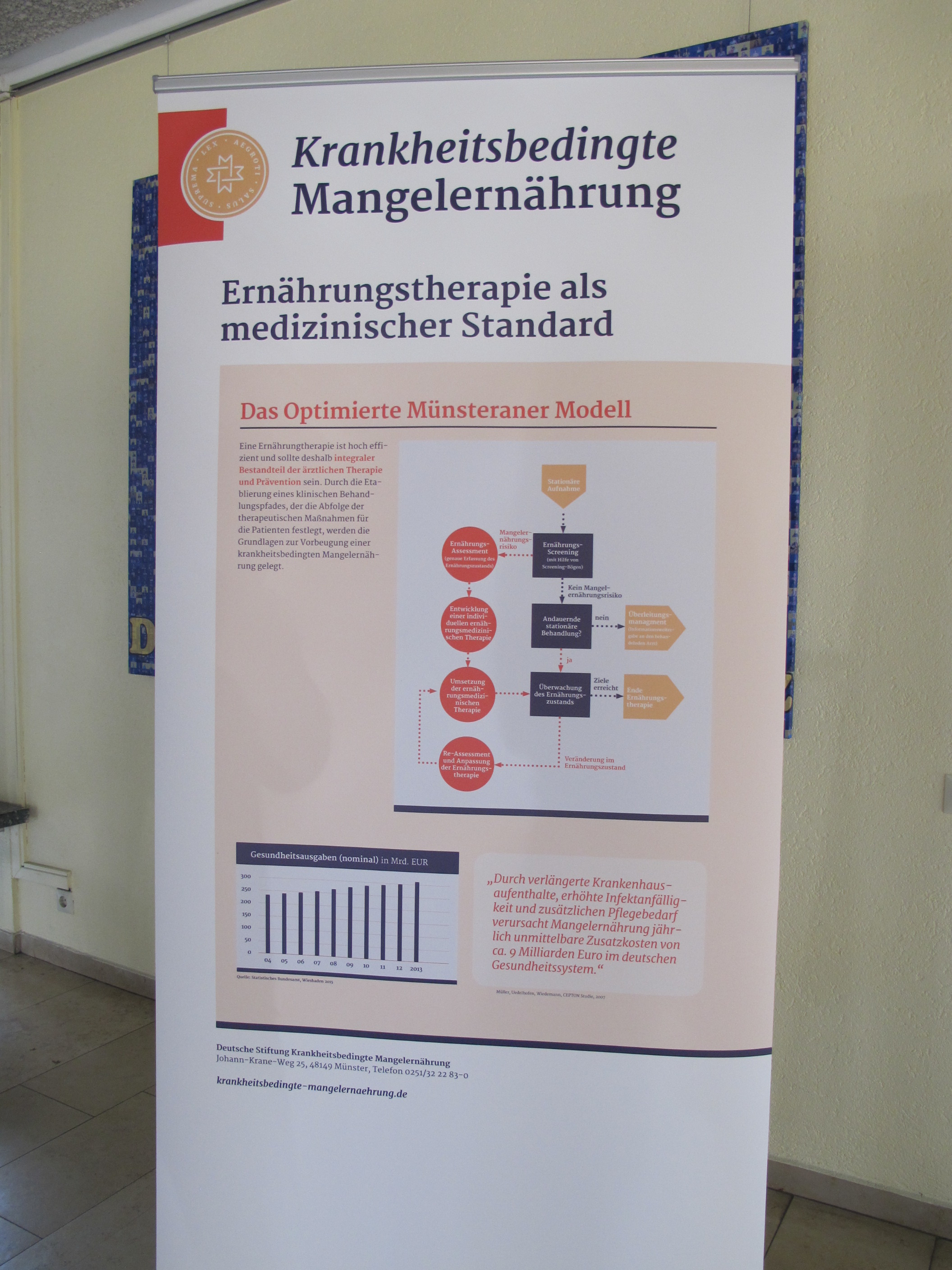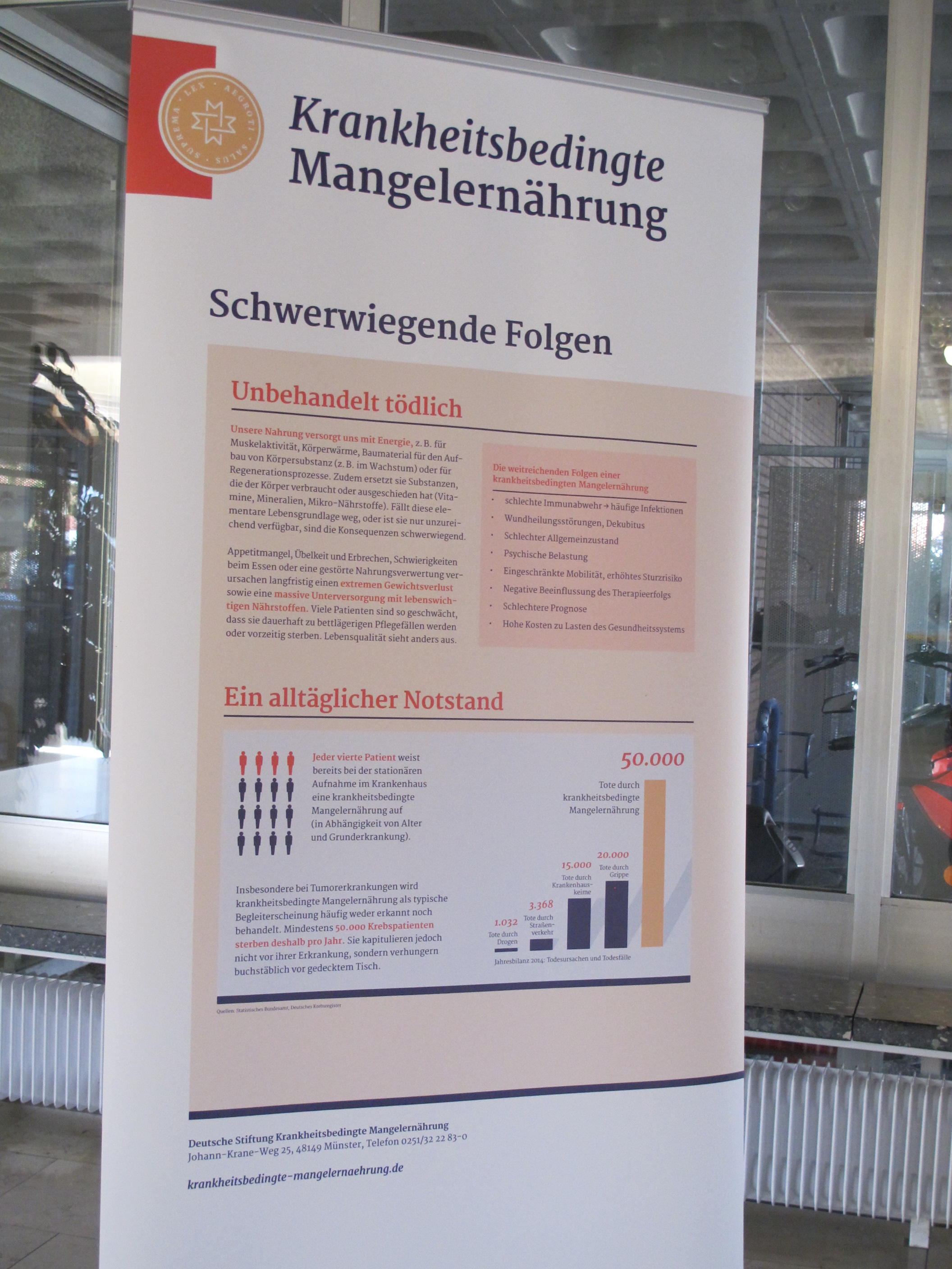 Sechs Roll-ups und eine Vitrine mit ernährungsmedizinischen Gebrauchsgegenständen (z.B. ein Torso mit einem Portsystem, Portnadeln, ein steriles Versorgungs-Set, Trink- und Sondennahrung, etc.) sollen interessierten Besuchern die Gefahren und Folgen, aber auch die Diagnosemöglichkeiten und Therapiechancen der krankheitsbedingten Mangelernährung anschaulich vor Augen führen. Ein Kurzportrait der Stiftung gibt es natürlich auch, Postkarten zur Anforderung weiterer Informationen sowie Flyer liegen aus.
